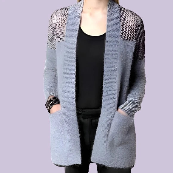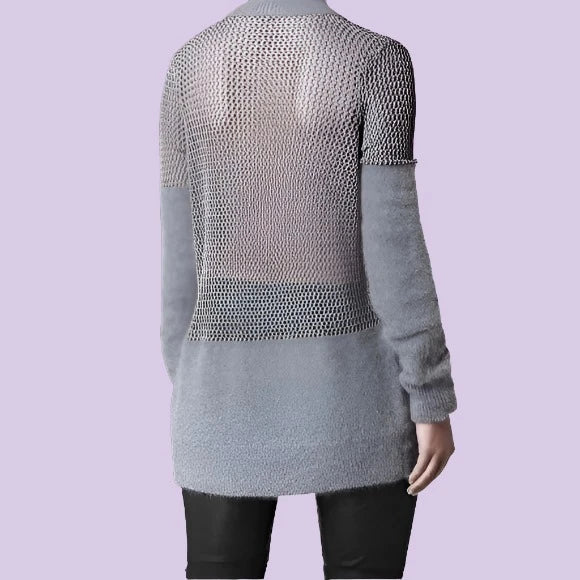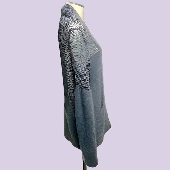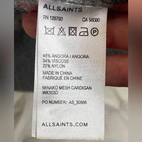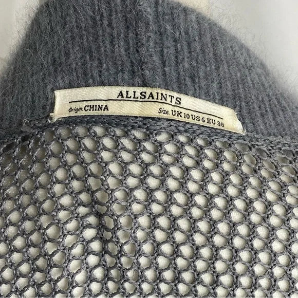 All Saints Grey Angora Mesh Minako Cardigan in good condition. Gorgeous cozy angora blend with edgy mesh detailing. Open front cardigan. Measurements are approximate: Armpit to armpit is 18 inches; length of cardigan is 31 inches and the length of the sleeves is 30 inches.