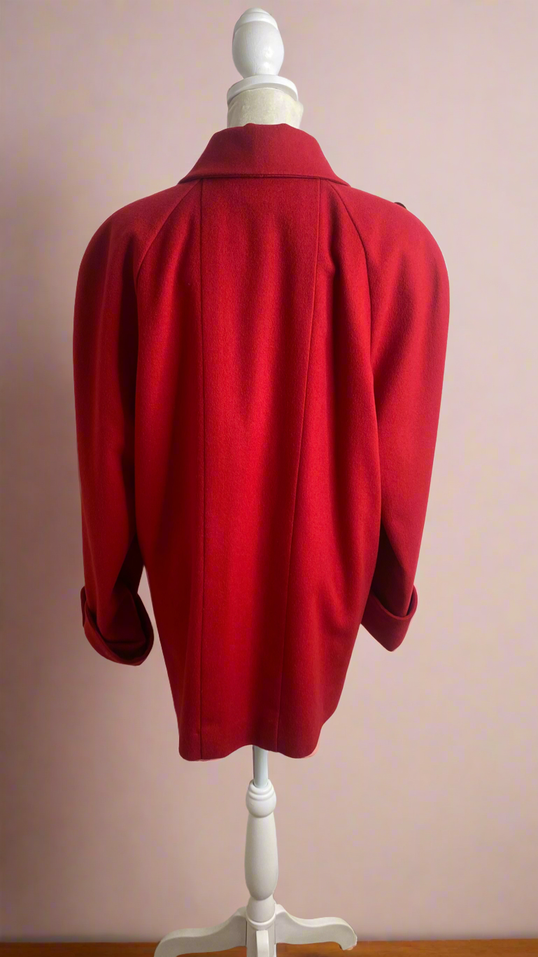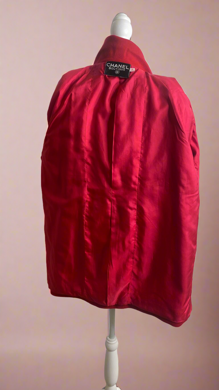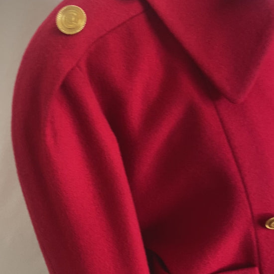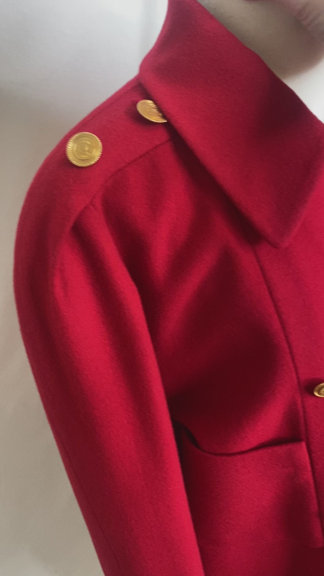 Chanel Vintage 90s Military Inspired Double Breasted Cashmere Jacket. In excellent condition! This cashmere red jacket is absolutely exquisite with very minimal wear. The jacket almost looks brand new, and the buttons and cashmere are in pristine condition. This jacket is from the 90s (Karl Lagerfeld era) and has been very well preserved. See photos and videos for further details. Also note that this Chanel piece was purchased at a reputable vintage shop in Los Angeles and includes the hanger. Also see Chanel tag.