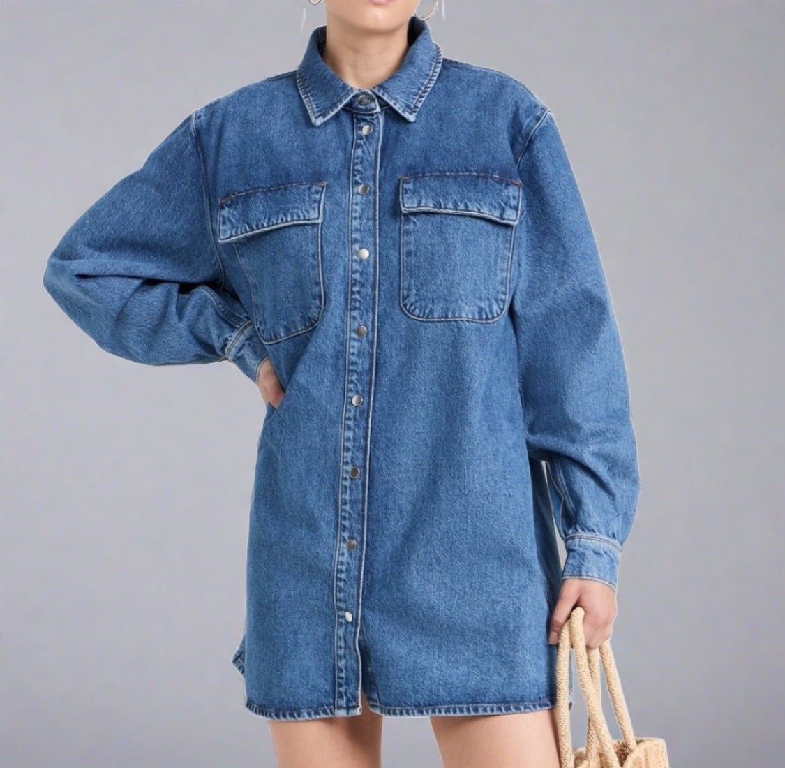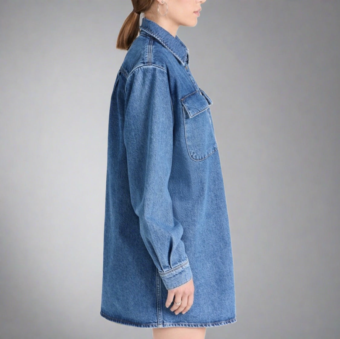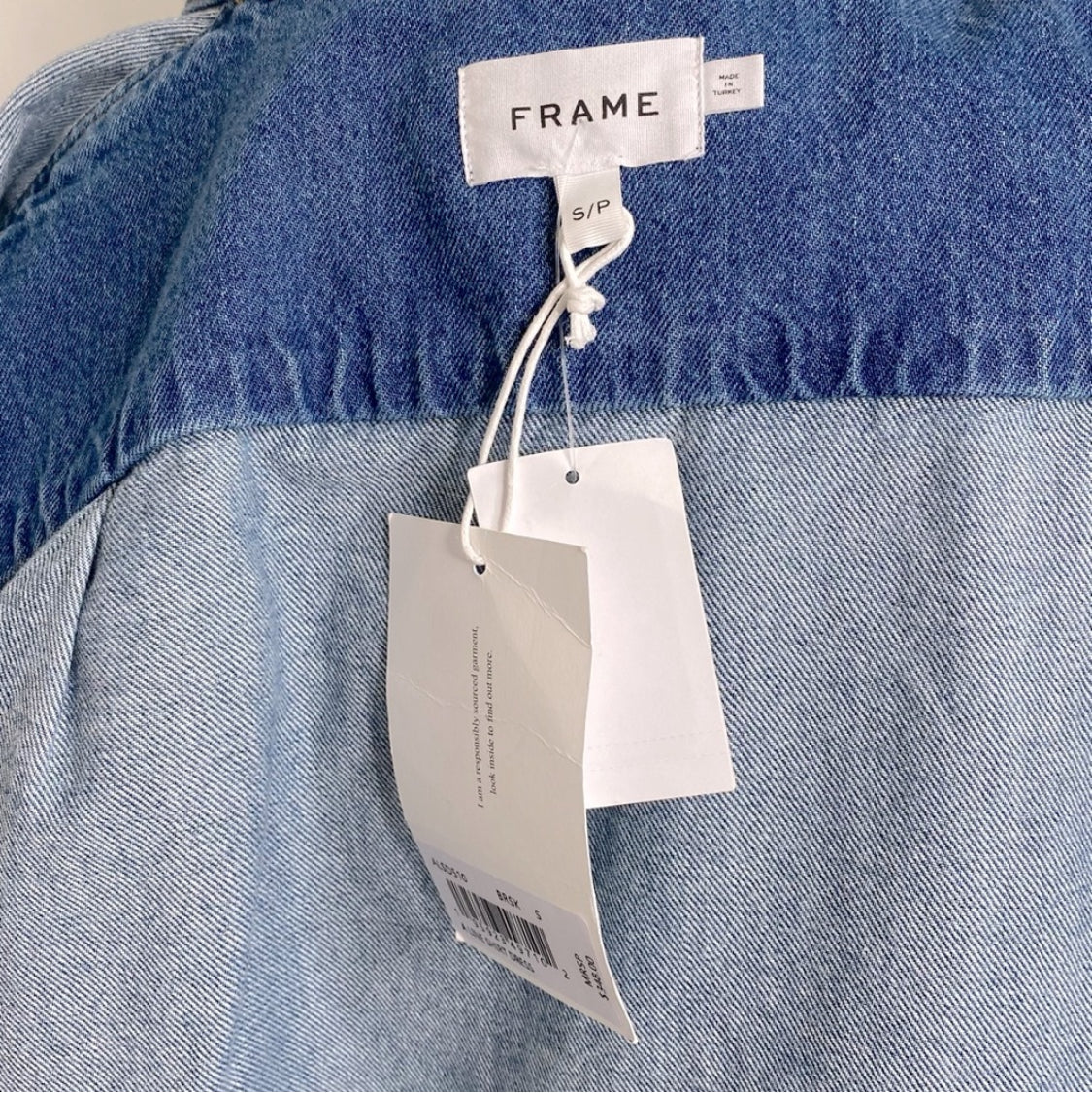FRAME Denim A-Line Shirt Dress size small petite. Although this is a size small (and is petite) as you can see from the model, it's meant to fit oversized. Oversized is the denim look for the season! The style, feel, and look are all giving industrial. This dress is brand new and still has the tags on it.