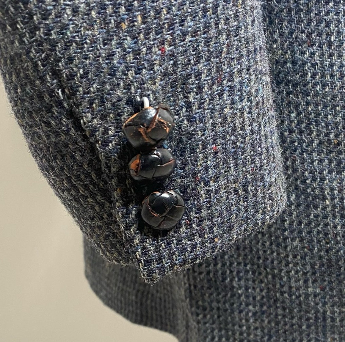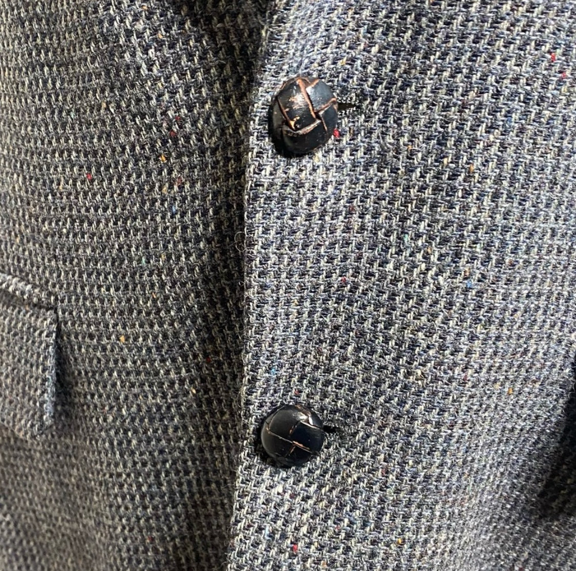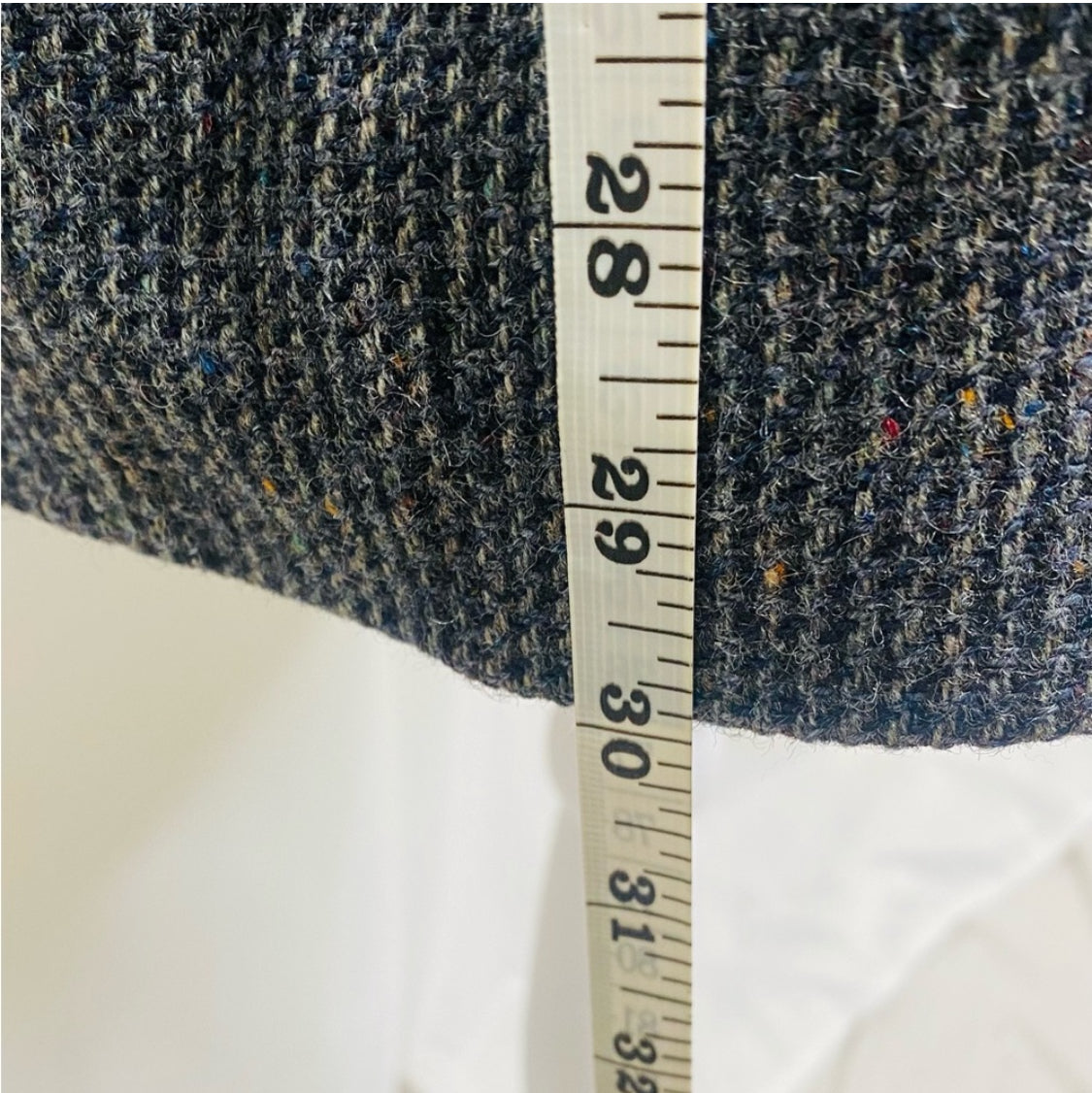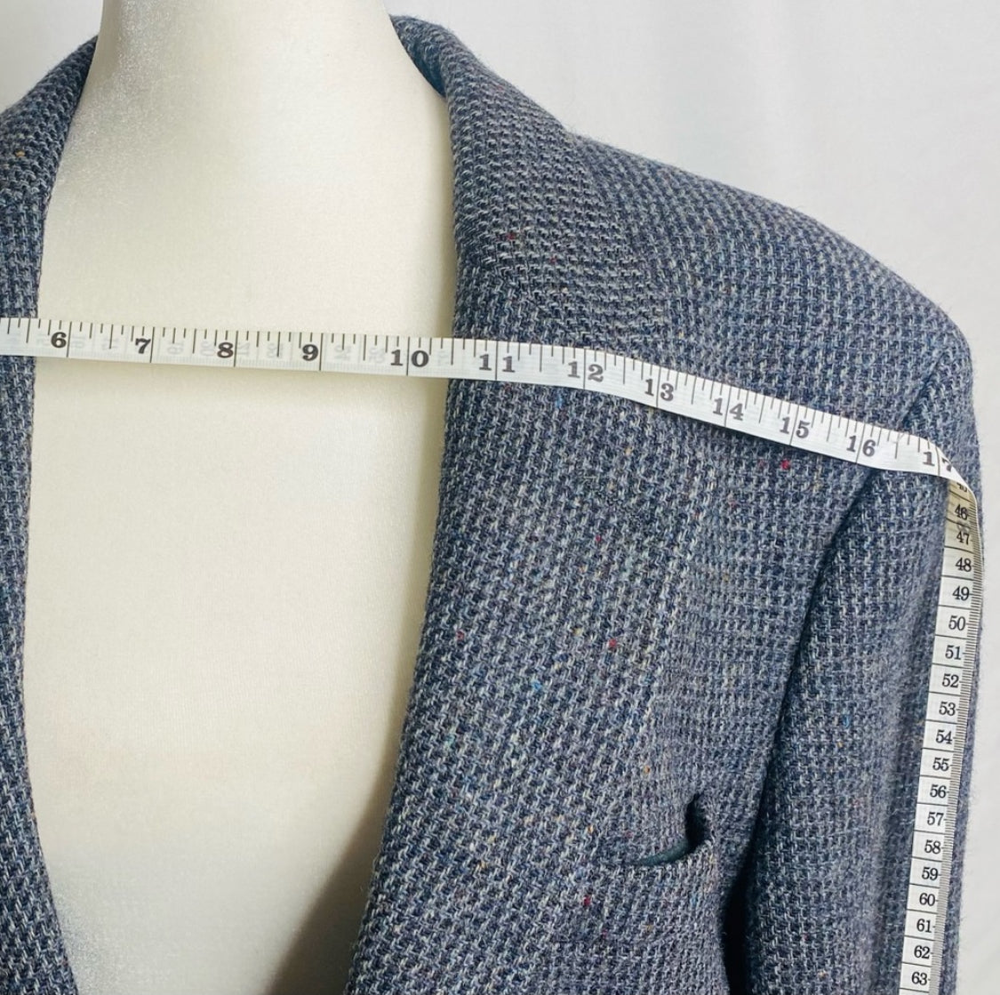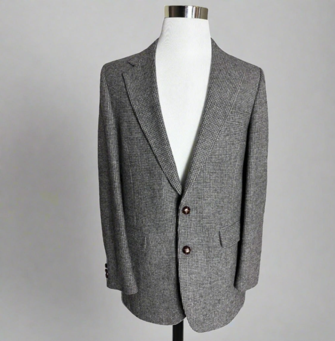 Atter looking at some measurement charts, this appears to be a 36 R *blazer did not come with a size tag. With grey, white, black and red undertones the color is giving me brick. This is one of the most exquisite blazers I have ever seen (notice the leather buttons and the pleaded details). They simply don't make clothes like this anymore!