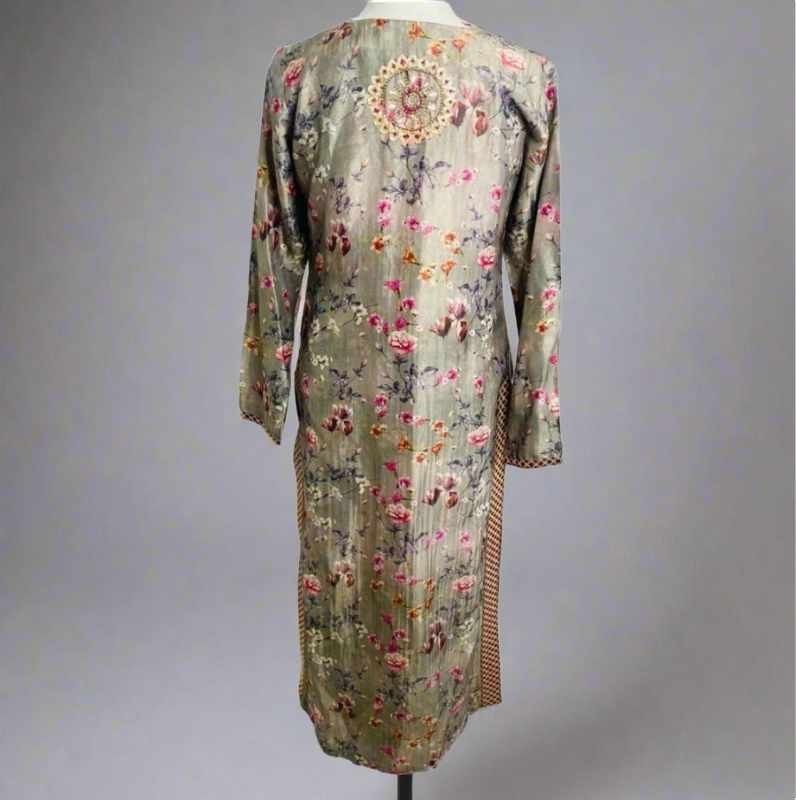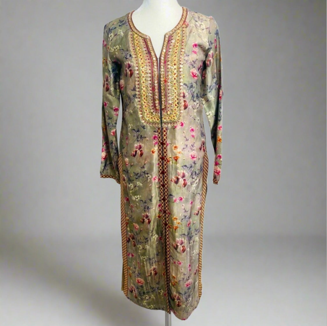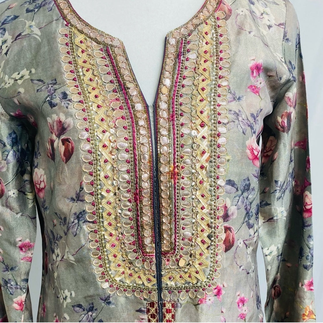 Ravina Pakistani Kameez/ Tunic Dress, size small with flower pattern, hand made with exquisite details. No fabric tag, one tag is present which states "Ravina." This is a one-of-a-kind piece. I was not able to find it anywhere on the Internet and will be priced accordingly. To the touch, the top fabric feels like silk. But I'm not 100% sure because again this did not come with any tags.