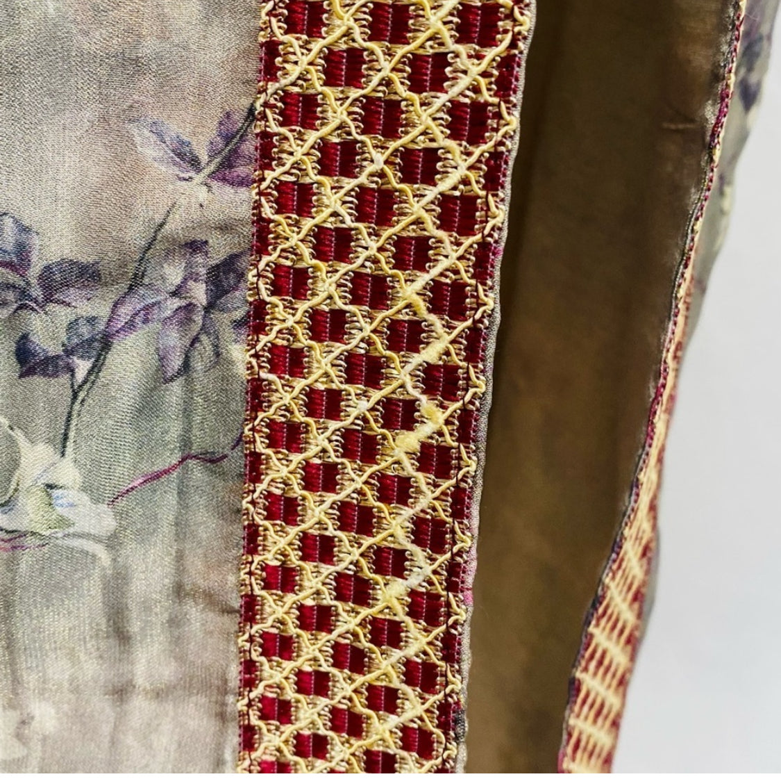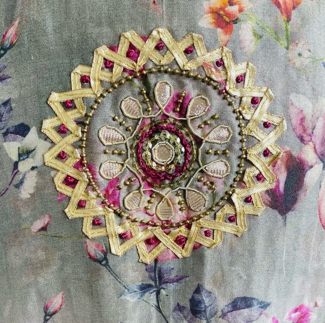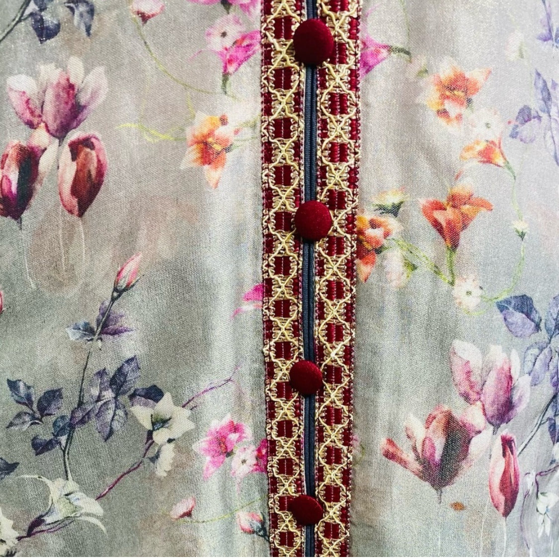Ravina Pakistani Kameez/ Tunic Dress, size small with flower pattern, hand made with exquisite details. No fabric tag, one tag is present which states "Ravina." This is a one-of-a-kind piece. I was not able to find it anywhere on the Internet and will be priced accordingly. To the touch, the top fabric feels like silk. But I'm not 100% sure because again this did not come with any tags.