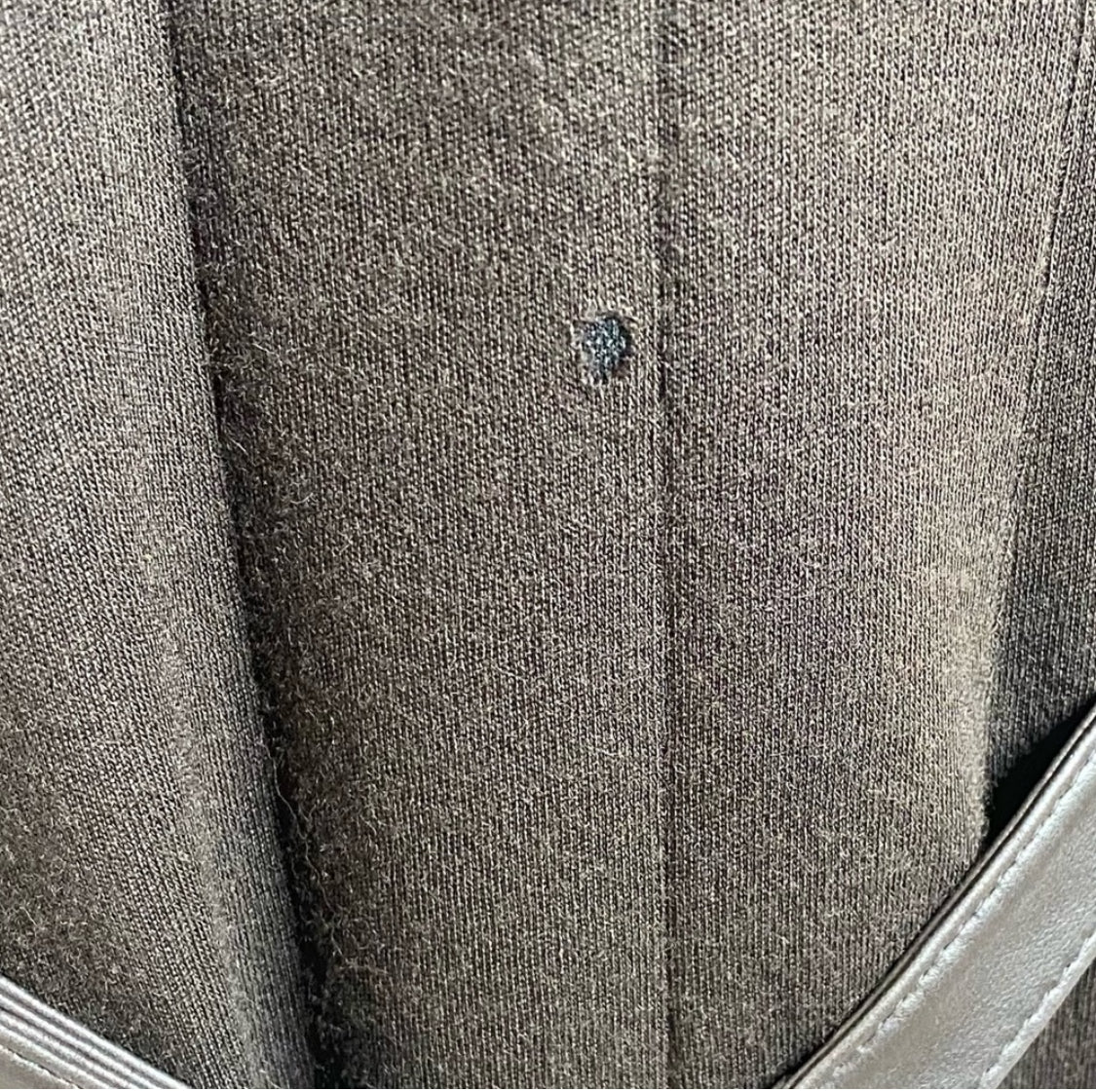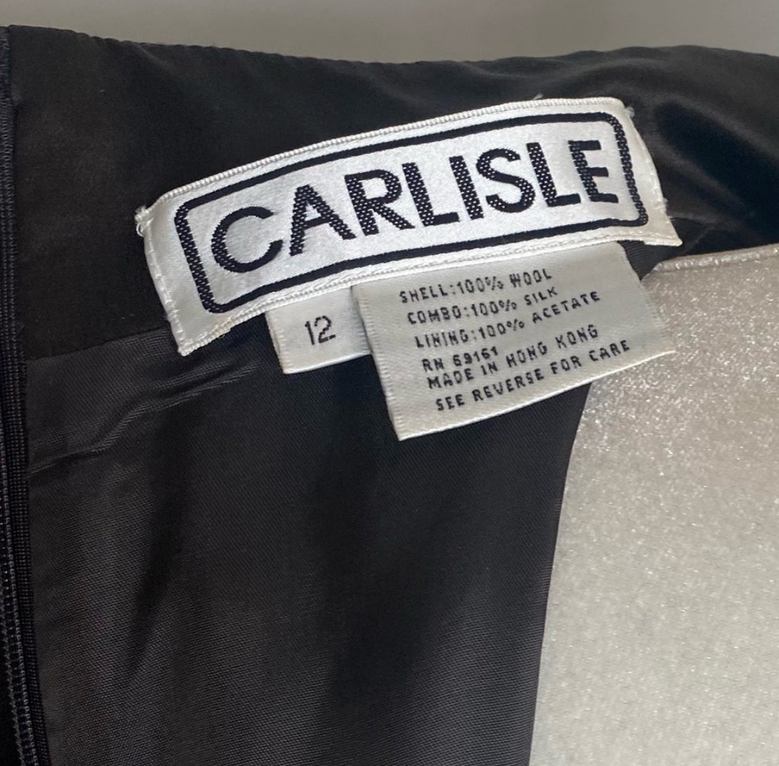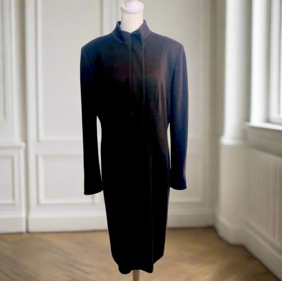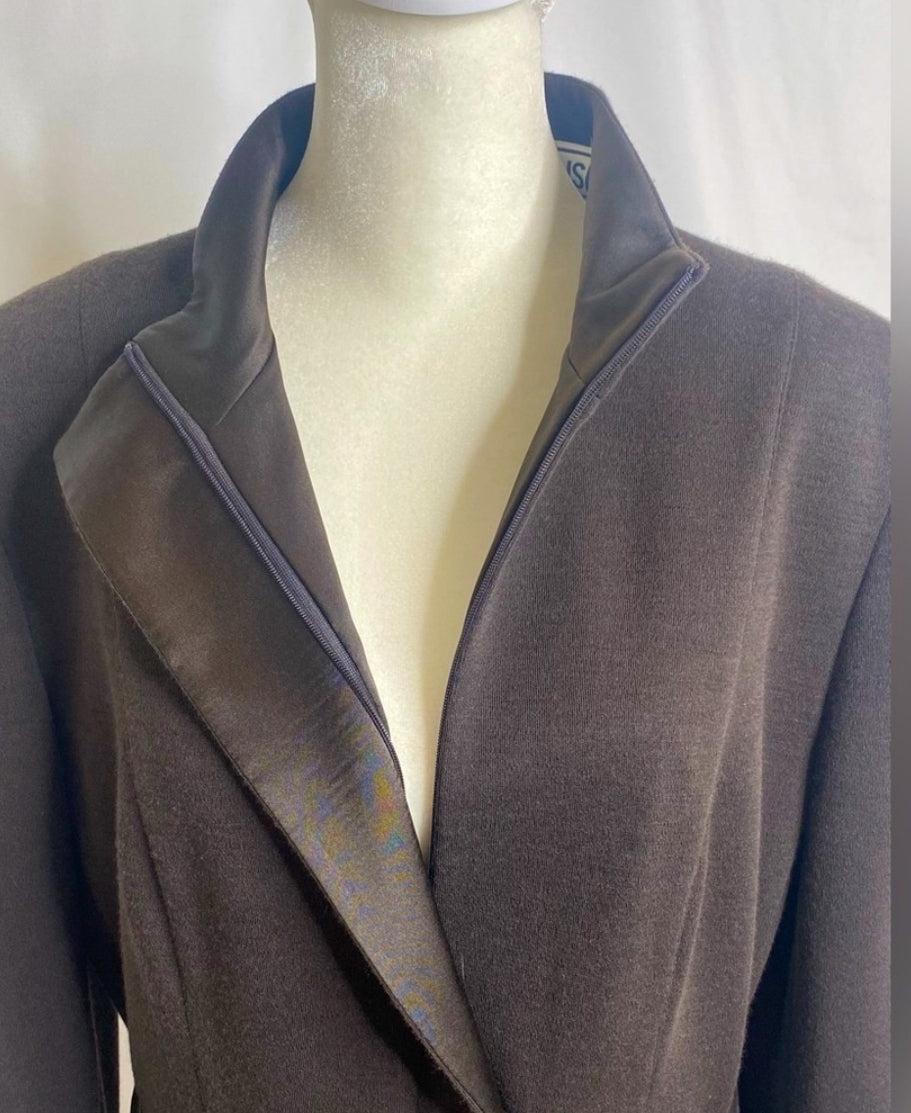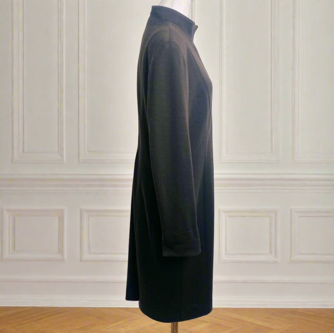Vintage Carlisle Wool Long Sleeve Midi Dress in brown size 12. In good condition, see photo with very small hole near the belt. See details of this beautiful piece: Mandarin color, pleated elegant design, zips up in the front and back, silk and wool blend.